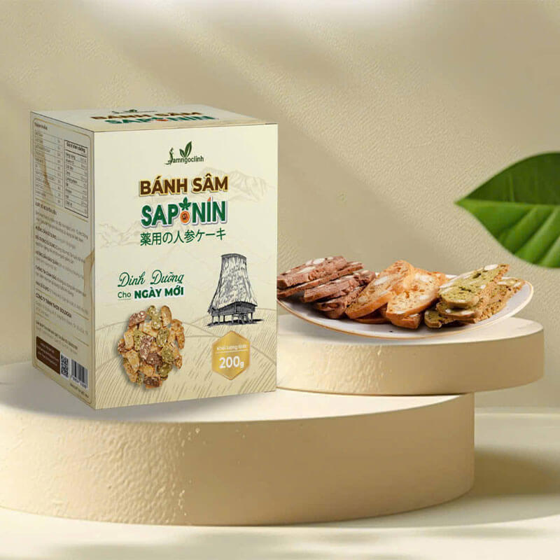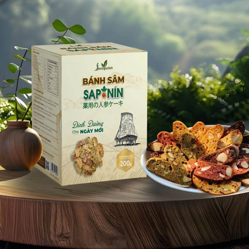 Saponin Ginseng Cake is a special nutritious snack made from rare Ngoc Linh Ginseng and Hong Dang Ginseng extracts, combined with nutrient-rich natural ingredients such as whole grain flour, ginseng jam, eggs, raisins, pumpkin seeds, almonds, milk, and honey. This delicious and nutritious product provides energy to the body while supporting daily health improvement.